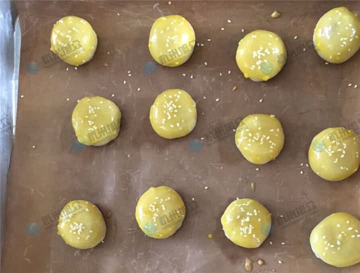 9、表面刷蛋黃液,用搟面杖頭在每個(gè)蛋黃酥餅胚頂粘上黑芝麻。