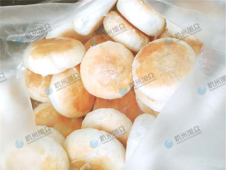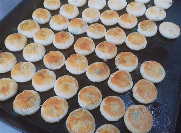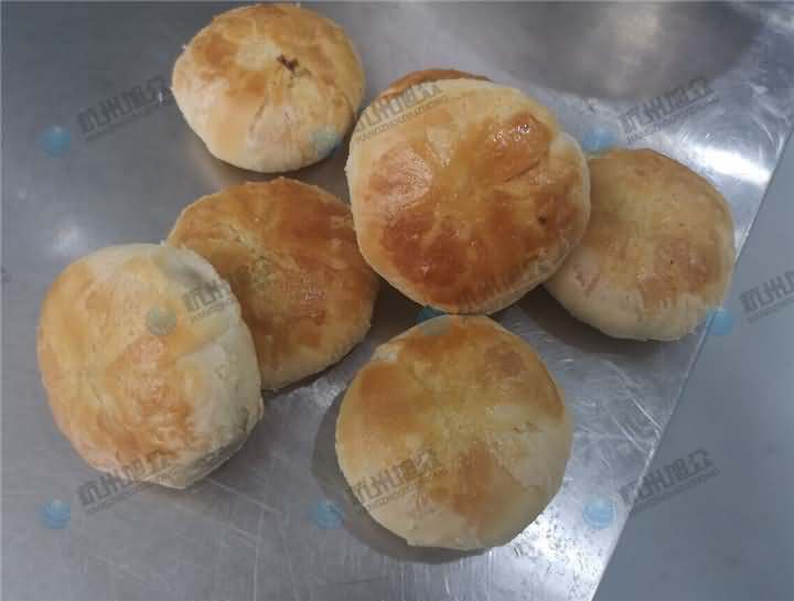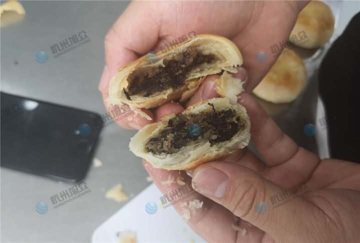 做酥餅啦,每天念叨著要吃梅干菜包子,今天客戶帶著梅干菜肉餡來到公司,以為是要做包子,結果是想考察酥餅機設備,于是便給他安排上了酥餅機試機,因為現在餡料有的,只需要做油面皮,前面步驟就不說了,跟以前一樣和面過程加入油,油面團和好后再加入油酥進去人工搟好面皮便可,將搟面的面皮放在酥餅機的上輸送架,餡料放入供餡機中,先調整面皮的克重之后再充餡,成型出來的酥餅放入預熱過的烘爐中烘烤幾十分鐘便可以了。